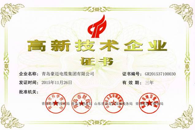 新年伊始,青岛豪迈电缆集团荣获了由国家高新技术企业认定管理工作领导小组审定,青岛市科学技术局、青岛市财政局、山东省青岛市国家税务局、青岛市地方税务局四部门联合颁发的国家级高新技术企业证书。
